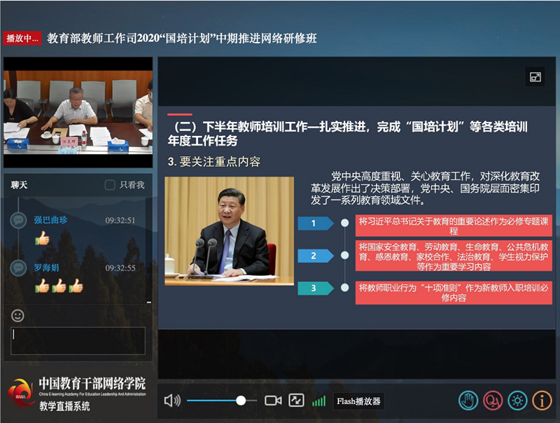 2020年7月30日,由教育部教师工作司主办,国家教育行政学院承办的2020年“国培计划”中期推进网络研修班顺利召开。教育部教师工作司司长任友群出席会议,并发表题为《奋战“十三五”收官 扎实推进“国培计划”实施》的讲话。本次网络研修活动通过中国教育干部网络学院直播平台开展。